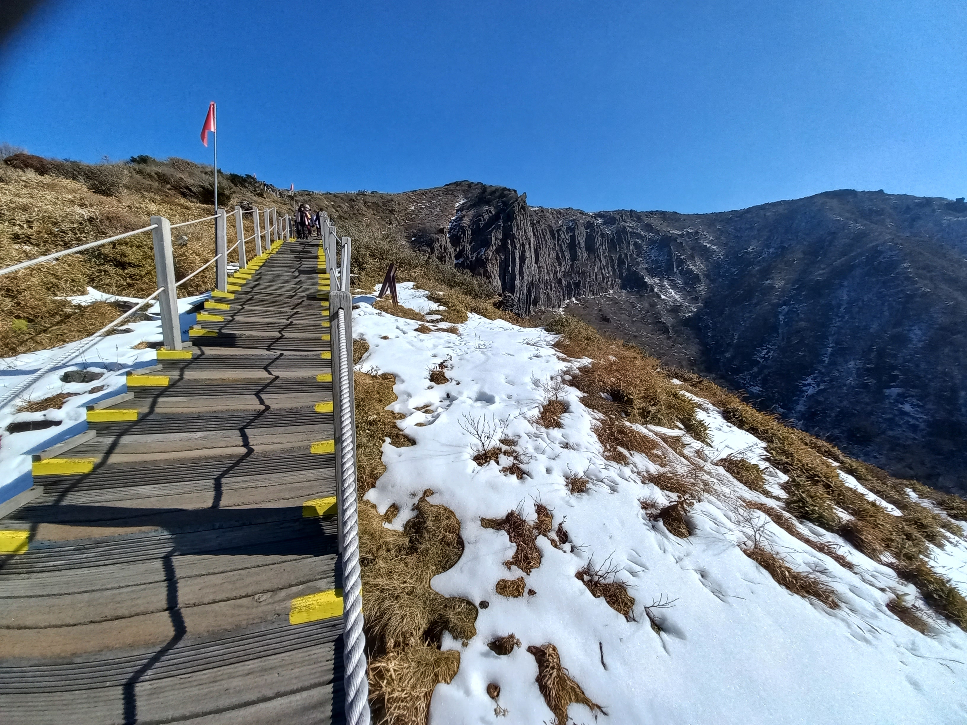 제주여행 3일째에 한라산에 오르기로 하였다. 성판악코스를 예약하였으나 코스가 길고 좋은 풍경이 없어 예약을 하지 않아도 오를 수 있는 영실코스를 택하였다. 열실주자장에서 윗세오름대피소까지 왕복하는 코스는 5시간 정도 소요된다. 다만 2000개가 넘는 계단길이 계속되어 식상할 수도 있으나 좋은 경치가 이를 상쇄시켜주고 있다. 한라산 상부는 이미 눈으로 덮혀 있다. 넓은 평원과 빼곡하게 들어서 있는 구상나무숲이 인상적이었으며, 병풍바위와 백록담 남벽의 웅장한 모습도 아름다운 자태를 뽐내고 있었다. 윗세오름 대피소는 한창 공사중이라 화장실정도만 이용할 수 있다.